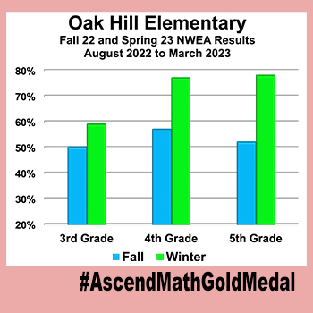 Oak Hill ES students have been closing the gap in Tier 2 Interventions this year with 86% of students completing one or more levels from September to March! These 3rd-5th grade students use of Ascend has resulted in a significant impact of increase in NWEA scores from the fall to winter assessments. The students feel motivated to work hard and this is reflected in their success.