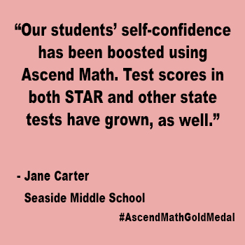 Our students' self-confidence has been boosted using Ascend Math.  Test scores in both STAR and other state tested have grown as well.  Jane Carter, Seaside_Middle_School