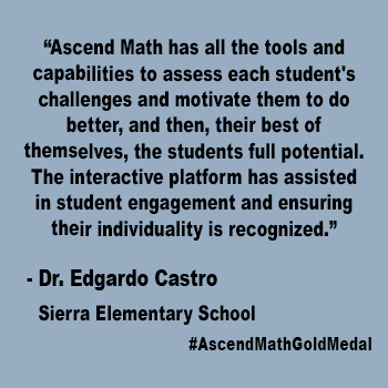 "Ascend Math has all the tools and capabilities to assess each student's challenges and motivate them to do better, and then, their best of themselves, the students full potential. The interactive platform has assisted in student engagement and ensuring their individuality is recognized". Dr. Castro, Sierra Elementary