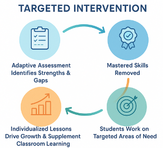 Response: Each student’s plan is built from adaptive assessments. Skills already mastered are removed, allowing students to work only on targeted areas of need. Because lessons adapt individually, intervention is differentiated and supplemental, not a replacement for classroom learning.