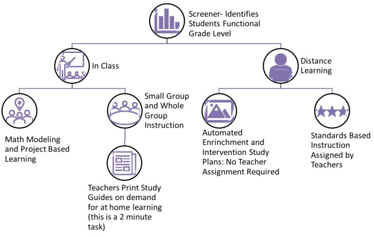 Ascend Math supports continuation of learning by offering automated on demand (asynchronous) instruction, real time data and reporting, plus guidance for teacher-led, small instructional groupings that may be delivered in classroom or distance learning environments.