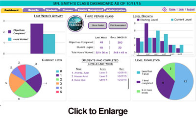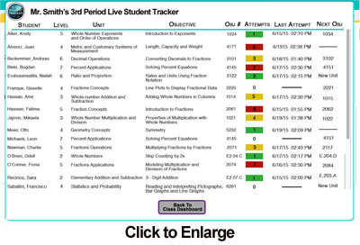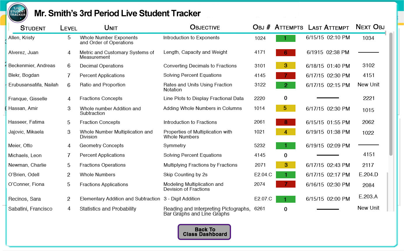 The Live Student Tracker provides critical, real-time information for each student in the class including: